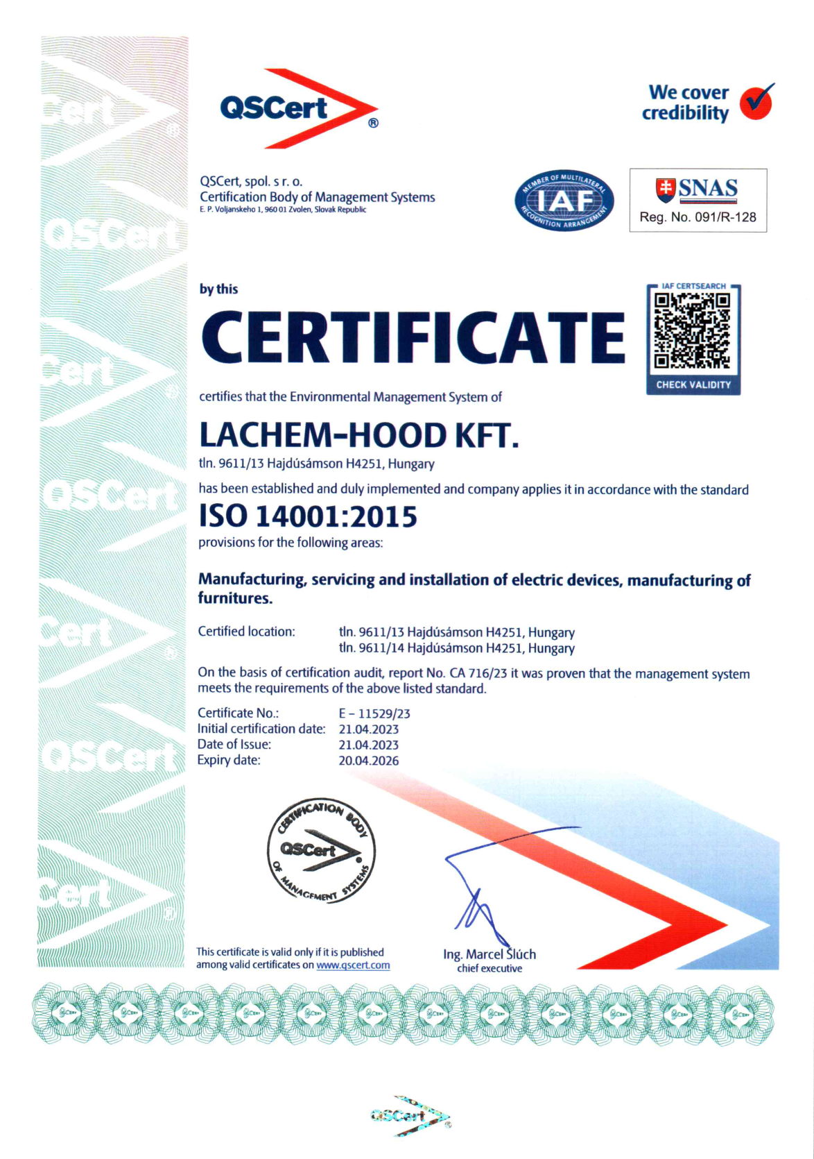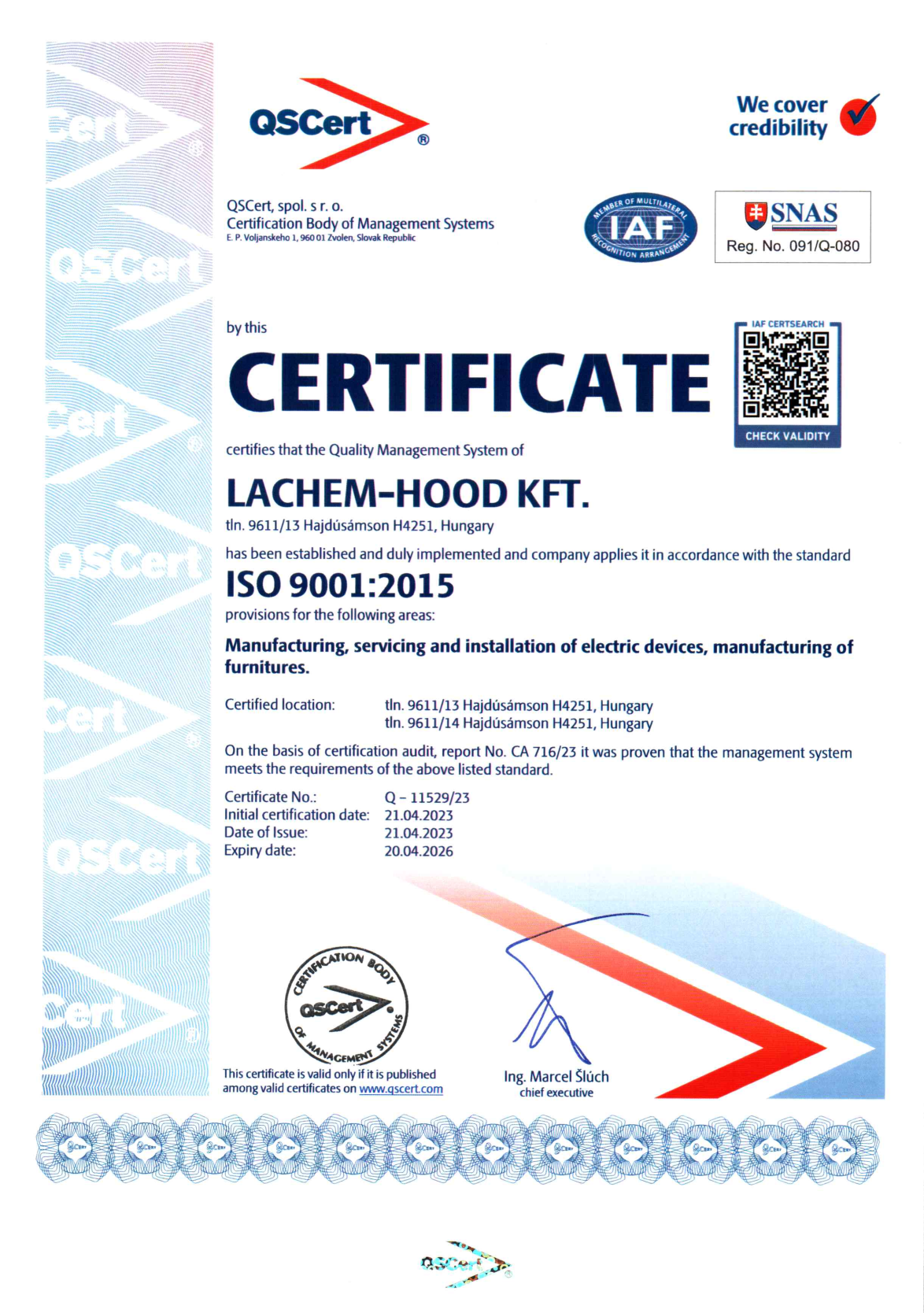 Lachem-Hood Ltd. was founded in 2012 with the aim of offering high-quality, domestically manufactured laboratory and office furniture, as well as metal structures, for the Hungarian and European markets. In the year of our establishment, we successfully developed our own line of chemical fume hoods, certified by TÜV (with verifiable validity), which has since remained one of our key products and complies with the European fume hood standard MSZ EN 14175-3.
