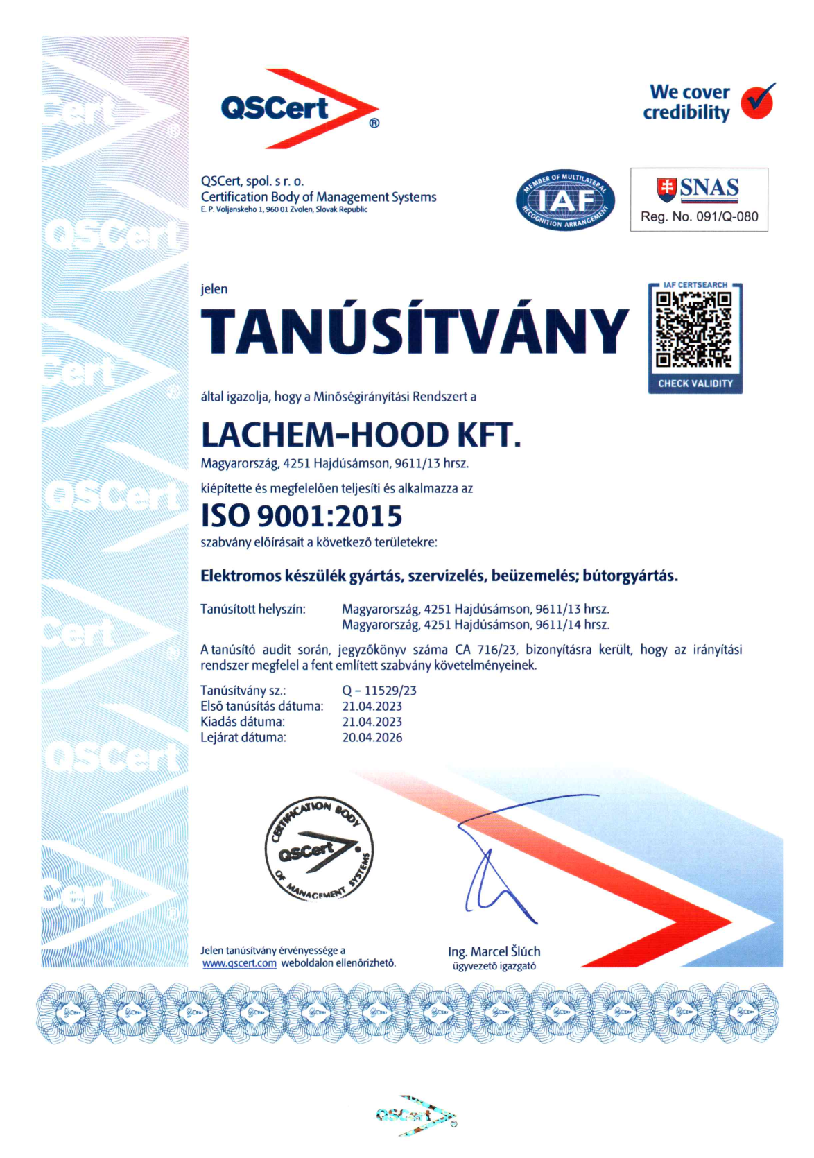A Lachem-Hood Kft. 2023-tól bevezette az ISO 9001:2015 minőségirányítási rendszert az alábbi területeken: