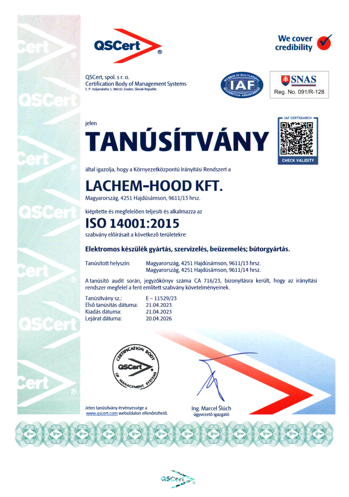 A Lachem-Hood Kft. 2023-tól bevezette az ISO 14001:2015 környezetirányítási rendszert az alábbi területeken: